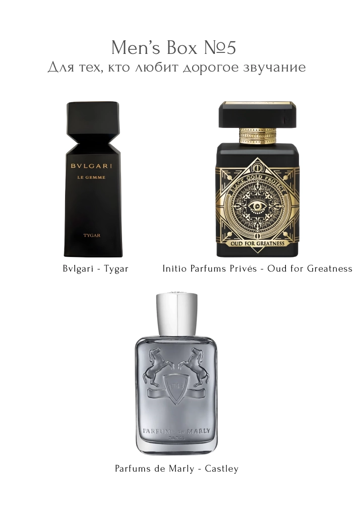 «Men’s Box №5» — это набор для мужчин, которые выбирают масштаб и качество. Эти ароматы вызывают эмоции силы, статуса, уверенности и магнетической притягательности. Они не просто дополняют образ — они делают его весомым, дорогим и по-настоящему запоминающимся.